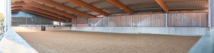 Unsere Reithalle ist 40 x 20 Meter und zu einer Seite offen. Der Stremmersand wird regelmäßig beregnet und abgezogen.